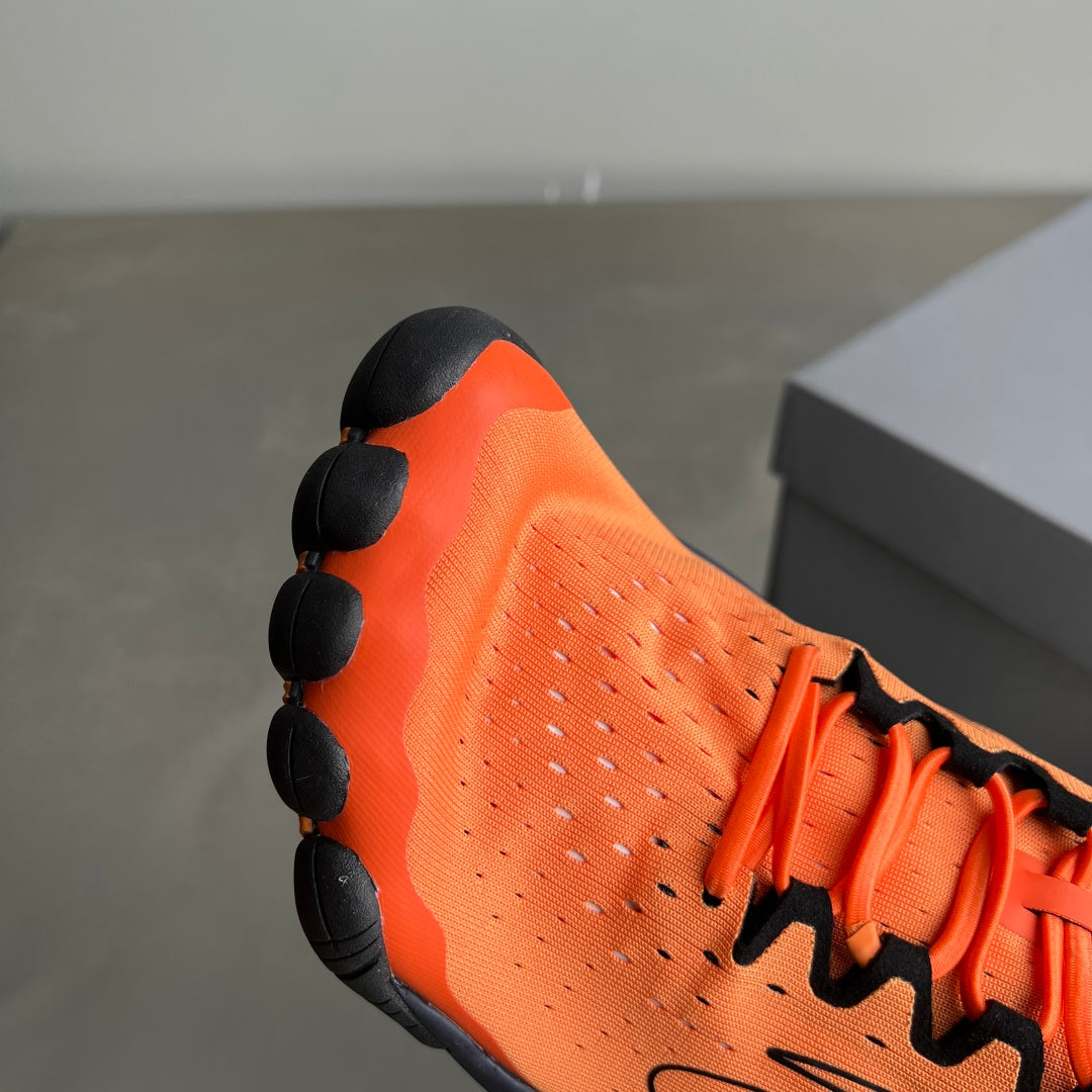 A futuristic low-top runner with a streamlined knit upper, anatomical toe shaping, and a sculpted performance sole. The bright orange body with black contrast detailing gives this pair a sharp athletic look, while the curved side graphic and sock-like fit keep the silhouette sleek and modern.