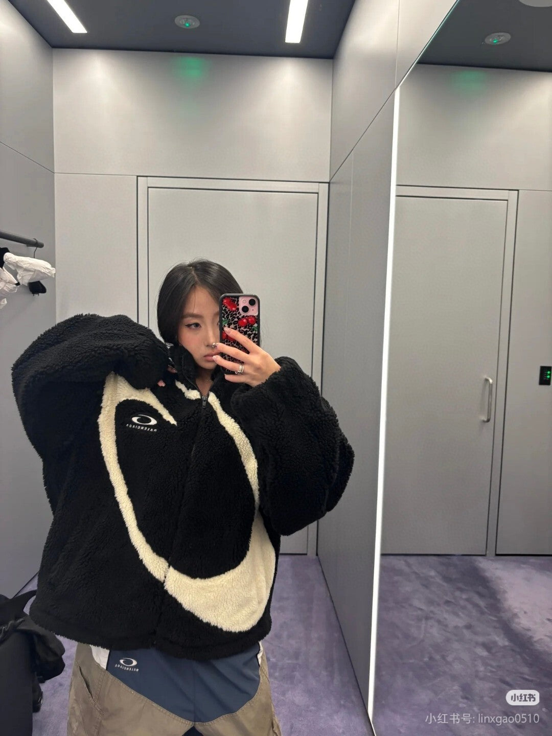 A bold winter layer with a striking curved contrast design across the front. The plush sherpa texture delivers warmth while the oversized silhouette creates a relaxed streetwear feel.