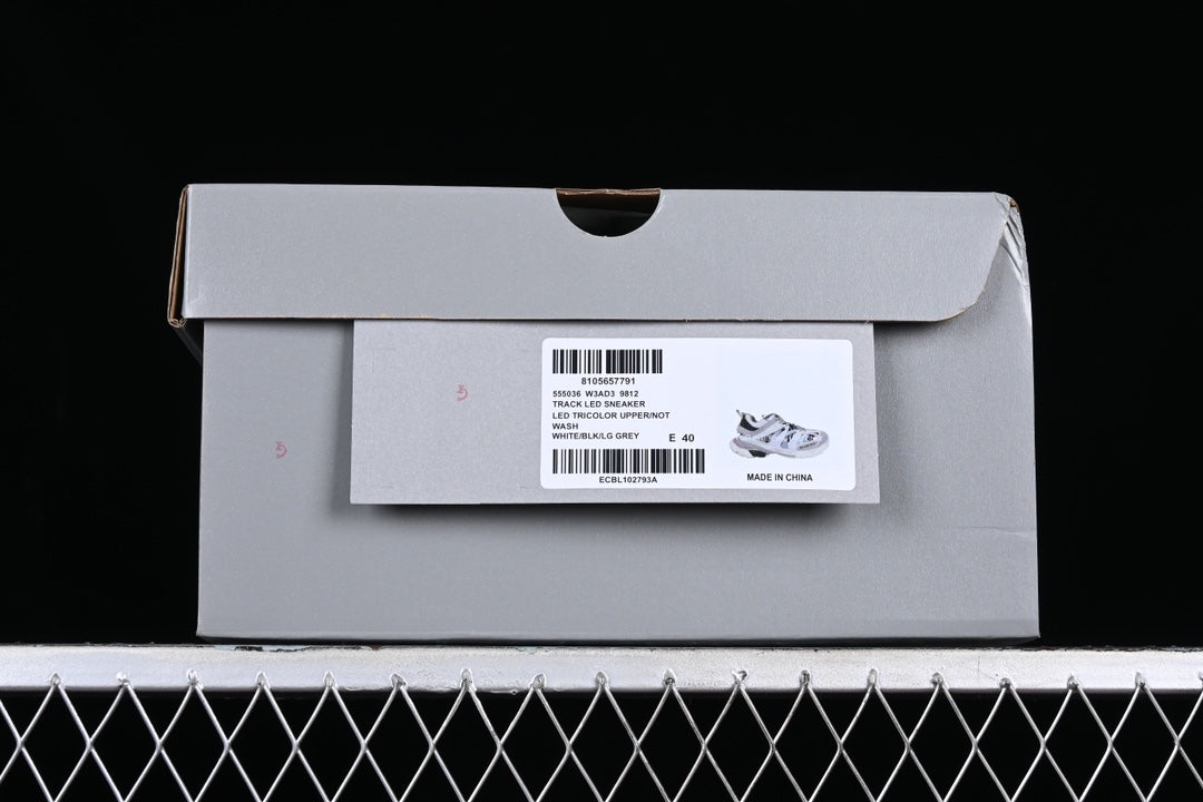 A technical low-top runner with a layered cage upper, sculpted sole, and integrated LED heel section that gives the silhouette a more futuristic edge. The white base is sharpened with black and grey contrast details, keeping the overall look clean while still highlighting the shoe’s engineered structure.