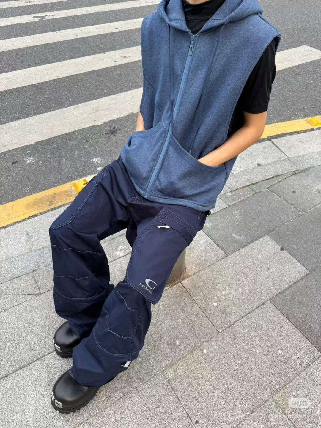These technical wide-leg cargo trousers are designed with a strong, structured silhouette and a relaxed fit. Built for durability and everyday wear, they feature reinforced stitching, functional cargo pockets, and a balanced weight that holds shape throughout the day. The deep navy tone and oversized proportions give a modern, high-fashion utility look that works effortlessly with minimal tops or layered outerwear.